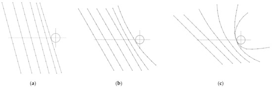 As shown in Figure 7a, at 1.43 × 10−4, the fibre plays a role as a rigid fibre and it rotates about its centre of mass. As the dimensionless shear rate, , increases, the fibre shows a flexible behaviour, and the end of the fibre deforms, as shown in Figure 7b. By increasing the dimensionless shear rate, 3.2 × 10−3, the S-shape flexibility that is reported by Forgacs and Mason [19] is observed (Figure 7c). Other research has reported similar results [8,32].