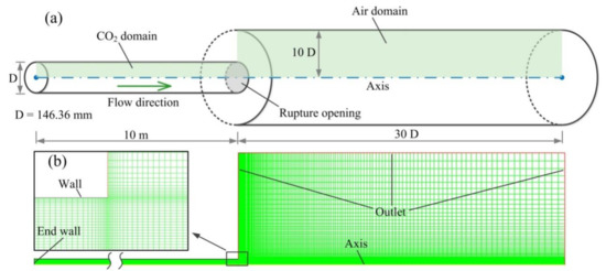 The calculation model consisted of a CO2 domain and an air domain, as shown in Figure 1a. The length of the CO2 domain of the computational model was 10 m and the diameter D was 146.36 mm; while the length of the air domain was set as 30 D, and the radius was 10 D. Since the duration time (tens of milliseconds) of the decompression process was short, the effect of gravity was ignored. A two-dimensional axial symmetric model, which was suitable for current calculations, was used to speed up the calculations [29,30]. For the axisymmetric boundary, the fluxes of all quantities across the boundary were 0. The upper and side edges of the air domain were set as pressure outlet boundaries; the pipe wall was set as a nonslip and adiabatic wall, and a standard wall function was used for the near-wall domain. The “end wall”, however, was defined as a wall when the initial flow velocity of the CO2 domain was 0, while as a velocity inlet boundary condition when the CO2 domain had an initial flow velocity. In the latter cases, the values of velocity and initial pressure on the inlet boundary were equal to the initial flow velocity and pressure of the CO2 domain, respectively. The mass flow rate on the velocity boundary condition was defined as: