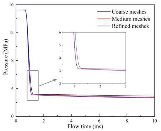 Three types of computational meshes were used for grid sensitivity analysis, namely coarse meshes (mesh number was 13K), medium meshes (mesh number was 24K) and refined meshes (mesh number was 41K), and their sizes were 2 × 4 mm, 3 × 6 mm and 4 × 8 mm, respectively. Figure 2 shows the pressure results calculated by the three types of grid sizes, and the pressure monitoring point was located at the installation location of the “P03” transducer. The pressure curves by the medium meshes and the refined meshes were basically the same, while the pressure drop time predicted by the coarse grid was slightly longer, which was about 8.7% larger than the predicted value by the medium meshes. That is, the influence of the mesh densities on the calculation results of the medium meshes and refined meshes was not significant. Therefore, the medium meshes were used in the later calculations.