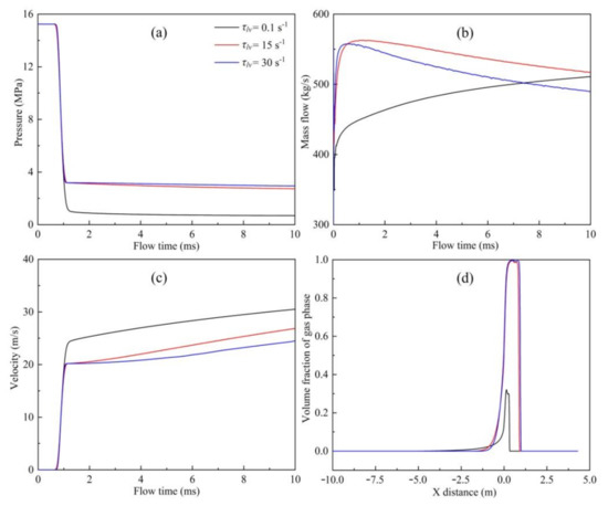 Effects of evaporation coefficient τlv on (a) pressure, (b) mass flow, (c) flow velocity and (d) volume fraction of gas CO2 phase at flow time of 10 ms. The location of 0.0 m is the rupture opening.