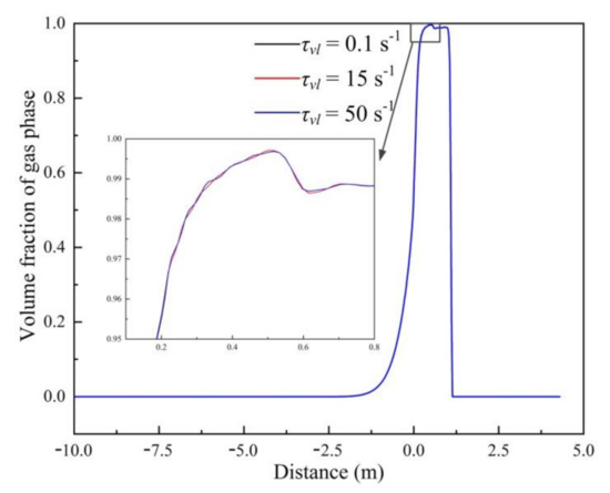 The effects of the condensation coefficient τl on the volume fraction distribution of gas phase CO2 are shown in Figure 4. Since the liquid CO2 within the pipe changes from liquid phase to gas phase during the decompression, the condensation coefficient has basically no effect on the decompression characteristics of CO2 inside the pipe. It can be clearly seen that the volume fraction of gas-phase CO2 in the domain near the rupture opening (at the location of 0.5~0.6 m) drops slightly after reaching the peak value, which indicates that part of the CO2 gas has transformed into liquid CO2. That is, condensation has occurred in the domain out of the opening. However, only a very small part of gaseous CO2 has transformed into liquid CO2, and the volume fraction of gaseous CO2 only have dropped by about 0.01; therefore, the influence of the condensation coefficient can basically be ignored.
