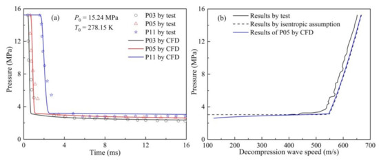 Since the evaporation coefficient has a great influence on the prediction results of the CFD model, it is necessary to set the evaporation coefficient reasonably and verify the established CFD model. Figure 5 shows the comparison of CFD-predicted results of pressure and decompression wave speed with the shock tube test results. The initial pressure and initial temperature of CO2 domain set in the CFD model were consistent with the shock tube test, which were 15.24 MPa and 278.15 K, respectively. The evaporation coefficient and condensation coefficient in the CFD simulation were both set as 15 s−1 [30]. The results showed that the sudden pressure drops and “pressure plateau” values predicted by CFD at the location of pressure transducers “P03”, “P05” and “P11” were in good agreement with the test results. The decompression wave speed by CFD, however, was also in good agreement with the results by test. It should be noted that the Span–Wagner EoS used in the isentropic assumption in the figure was also adopted in the CFD model. In spite of this, the decompression wave speed predicted by the isentropic assumption was different from the CFD-predicted results, which indicated that the decompression process of liquid CO2 could not be regarded as a simple isentropic process due to the heat and mass transfer.