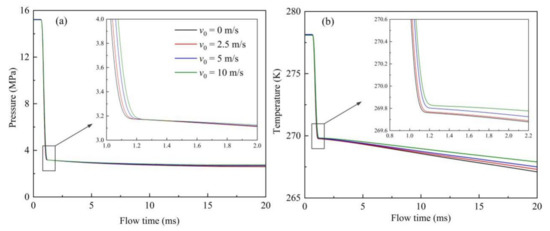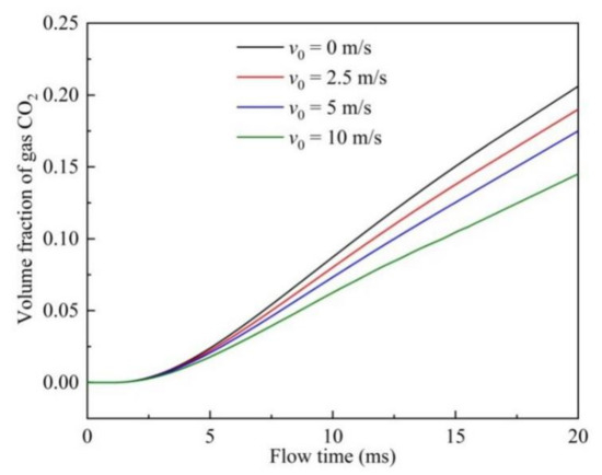 The liquid CO2 in the long-distance transportation pipeline is always in a flowing state and has a certain initial flow velocity at the moment of the pipe rupturing. It can be seen from the established mass transfer models that the flow velocity does not directly affect the mass transfer of the phase transition [24,32]. However, the indirect influence of flow velocity on mass transfer of the phase change needs further investigation. The effects of flow velocity on pressure drop and temperature drop are shown in Figure 6. Since the propagation direction of the decompression wave is opposite to the outflow direction, the initial flow velocity reduces the propagation speed of the decompression wave but shows a minor effect on the “pressure plateau” value. However, the initial flow velocity has a major impact on the temperature drop. The lower the initial flow rate, the faster the fluid temperature drops. As the flow time increases, this phenomenon becomes more and more significant, which makes the fluid more prone to phase transition, resulting in a higher volume fraction of gas CO2 phase in the same flow time, as shown in Figure 7.