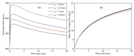 It can be seen from Equation (9) that the mass flow rate is directly proportional to the flow velocity. The higher the initial flow velocity is, the greater the total mass flow at the rupture opening, as shown in Figure 9a. Notably, the total mass flow of the outlet reached a peak value in a short time (about 1 ms), then decreased slowly and tended to be stable gradually. The mass flow of gas CO2 gradually increased from 0 kg/s, but the increasing rate gradually slowed down, as shown in Figure 9b. The mass flow of gas phase CO2, however, increased with the increase in initial flow velocity. In addition, it was found that the mass flows of gas CO2 with different initial velocities were all about 20 kg/s at a flow time of 20 ms, and the total mass flows were all above 500 kg/s, which indicated that most of the CO2 fluids leaking from the rupture opening were in a liquid state during decompression.