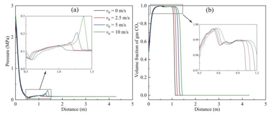 Due to a sudden drop of the fluid pressure near the rupture opening, the ejected liquid CO2 quickly vaporized into gas CO2. The volume fraction of gas CO2 near the outlet rapidly increased to a value of 0.997, as shown in Figure 10b. After that, the volume fraction of gas CO2 decreased to about 0.987. The reason was that the expansion of gas CO2 made the fluid temperature quickly drop to the saturation temperature, and a small amount of gas CO2 (about 1%) was condensed into liquid CO2. Since a higher initial flow velocity accelerated the propagation of the first compression wave, the distribution range of the gas CO2 volume fraction was extended.
