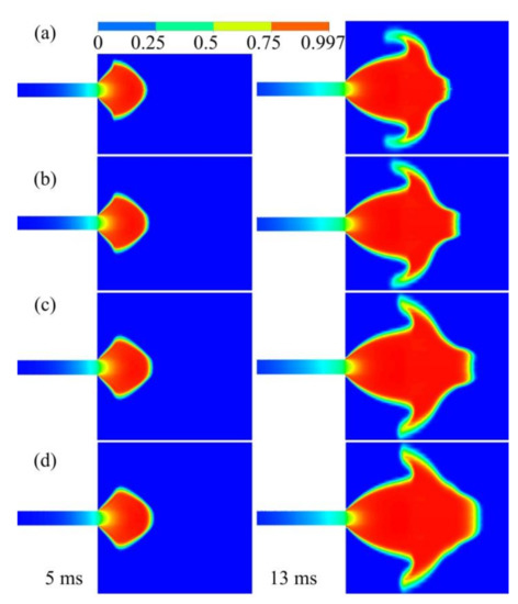 The volume fraction variations of gas CO2 are shown in Figure 11, where the initial flow velocity of case a, b, c and d are 0, 2.5, 5 and 10 m/s, respectively. It was found that the liquid CO2 ejected from the rupture opening rapidly transformed into gas CO2 during the decompression, and the maximum volume fraction of gas CO2 reached a value of 0.997. Meanwhile, the liquid CO2 in the pipe was gradually transformed into gas CO2 due to the sudden drop in pressure. However, the volume fraction of gas CO2 in the pipe was less than that outside the rupture opening, which indicated that the liquid–gas phase transition in the outer domain was more intense. The distribution range of gas CO2 volume fraction increased with the increase in the initial flow velocity. When the flow time was 5 ms, this effect was not obvious, but when the flow time reached 13 ms, it became significant. Notably that the contour with a gas CO2 volume fraction of 0.5, which was the reference level of the phase contribution [35], was always near the rupture opening (except for the jet boundary). Additionally, the volume fraction of gas CO2 in the pipe was always lower than 0.5 at the beginning of the leakage, which was due to the “delayed phase transition”.