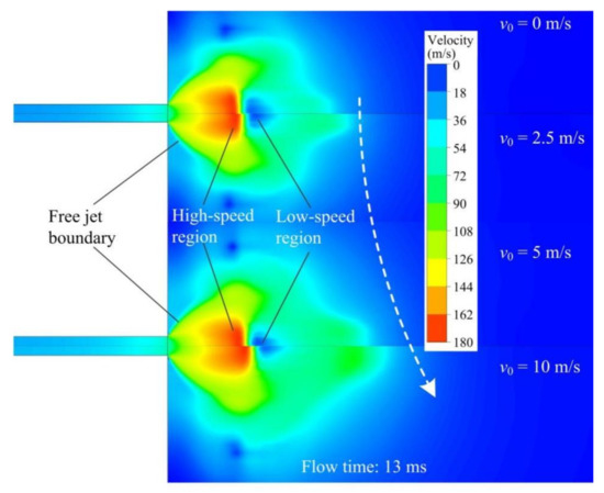 The near-field jet structures around the rupture opening are shown in Figure 12, which mainly includes free jet boundary, a high-speed region and a low-speed region formed by a series of back-propagating compression waves due to the fact that the local pressure was lower than the surrounding pressure. It was found that a larger initial flow velocity accelerated the formation of the near-field jet, that is, the high-speed region was widened while the low-speed region was narrowed. The maximum flow velocity of the high-speed region was only 180 m/s at a flow time of 13 ms. Similar experiments with an inner pressure of 15 MPa (liquid CO2) were carried by Liu [36], the measured maximum velocities of the near-field jets from nozzles with ID of 15 and 20 mm were 104.26 and 114.42 m/s, respectively. The maximum velocities of the near-field jets were much lower than that of the gas jets, the main reason was that the CO2 fluid ejected from the outlet was mainly composed of liquid CO2, which rapidly vaporized into gas CO2 and formed a gas–liquid two-phase flow in atmospheric environment. Compared with gas flow, liquid flow had a higher resistance when injected into the atmosphere. The resistance of gas–liquid two-phase flow, however, was in between them. That is, the expanding velocity of the gas–liquid two-phase flow was lower than that of pure gas flow.