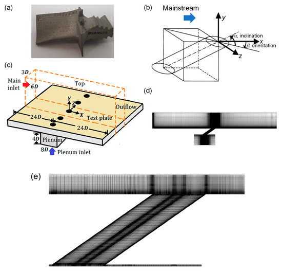Film cooling geometry and computational domain: (a) Gas turbine blade with film cooling holes; (b) injection geometry of film cooling; (c) computational domain; (d) grid system; and (e) close-up of the mesh near the hole.