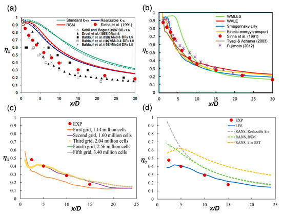 Harrison and Bogard [15] performed a RANS by using three models and as shown in Figure 2a, the centerline film cooling effectiveness prediction of the realizable k-ε and RSM models was more accurate than that of the k-ω. Considering the experimental conditions adopted by Sinha et al. [5], the LES was performed on four subgrid-scale models, as shown in Figure 2b and the findings were compared with two sets of LES data in the open literature [17,33]. The LES results for the effectiveness corresponded to a higher correlation with the experimental data than the RANS data, as shown in Figure 2a.