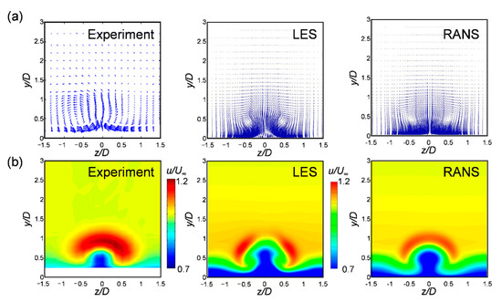 Time-averaged flow field at x/D = 2.5 for the streamwise film cooling when M = 1.0, compared with data from Burd et al. [35]: (a) Cross-stream velocity vectors and (b) streamwise velocity contour.