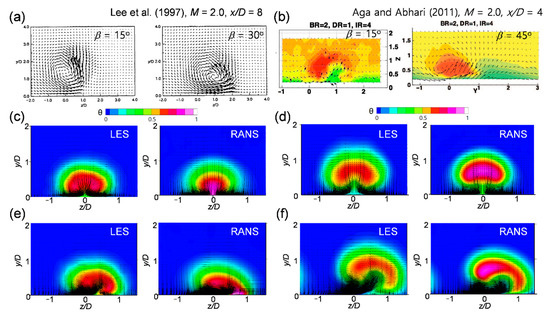 Time-averaged cross-stream velocity vectors with temperature contours at x/D = 2.5: (a) Cross-stream velocity vectors reported by Lee et al. [10]; (b) cross-stream velocity vectors with streamwise velocity contours, reported by Aga and Abhari [13]; (c) M = 0.5, β = 0°; (d) M = 1.0, β = 0°; (e) M = 0.5, β = 30°; and (f) M = 1.0, β = 30°.