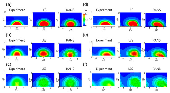 When the compound angle was adopted, the thermal field became asymmetric. This change in the temperature distribution was well predicted by both the LES and RANS (Figure 5d,f). However, in the case of the compound angle, the mixing characteristics could not be determined simply by considering the area of the hot part, as in the case of the simple angle. Nevertheless, the characteristics could be clarified considering the spacing of the isotherms. In particular, the isotherm spacing in the RANS was wider than that in the experiment.