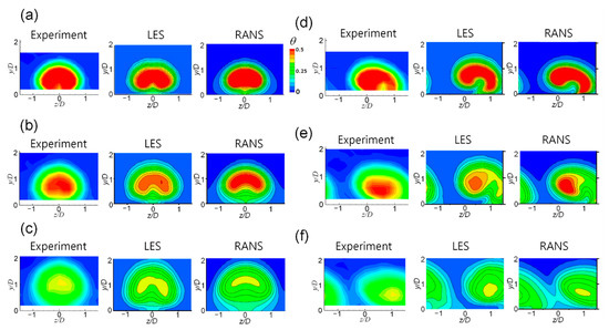 In the experimental data, the lift-off was unclear at the upstream locations (Figure 5a,b) because no data near the wall could be obtained through the cold wire measurement. At x/D = 10, as shown in Figure 5c, the center of the injectant appeared near y/D = 0.5 and lift-off could be observed in this part. The LES predicted that the lift-off occurred more intensely than that in the experiment, whereas the RANS did not predict any lift-off.