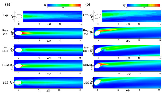 For the local distributions of the adiabatic cooling effectiveness, the LES data and RANS results obtained using three turbulence models were compared with the experimental data presented by Jung and Lee [11]. Figure 7 shows comparisons of the distributions at a blowing ratio of 0.5. In the case of both the simple and compound angles, the LES-obtained distribution was closer to that obtained experimentally than that of the RANS. In the upstream region within x/D = 2, the realizable k-ε and RSM overpredicted the film cooling performance and thus a region with high effectiveness (red contour) appeared, which did not appear in the experimental data. The k-ω SST did not severely overpredict the film cooling effectiveness in the upstream region however, the diffusion in the downstream, compared with the other models, was predicted to be smaller than the experiment value.