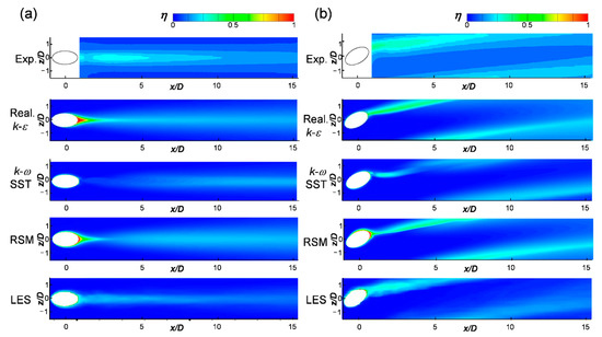 Figure 5 shows a comparison of the boundary layer temperature obtained through the CFD techniques at a blowing ratio of 0.5 with the experimental data presented by Jung and Lee [11] at three streamwise positions. At x/D = 2.5 with a simple angle (Figure 5a), the area of the high-temperature region (displayed in red) predicted by the LES was more similar to the experiment value. The RANS-predicted high-temperature region with a dimensionless temperature θ of 0.5 or higher was smaller than that in the experiment. Even at the downstream position, x/D = 5.0 (Figure 5b), the RANS underpredicted the intensity of mixing with the main flow compared to that obtained in the LES.
