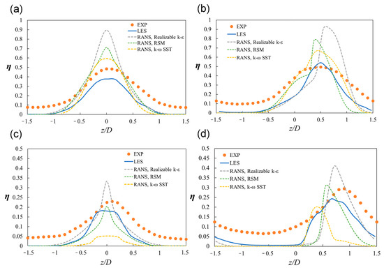 To examine the film cooling performance between the holes and film cooling characteristics in the spanwise direction in the composite angle case, Figure 9 shows the spanwise variation of the film cooling effectiveness at x/D = 2.5. The LES predicted the spanwise diffusion of the film cooling effectiveness better than the RANS. When the blowing ratio increased (Figure 9c,d), the CFD techniques could not predict the spanwise spread accurately. Among the turbulence models, the k-ω SST and RSM obtained the best predictions for the film cooling performance at the blowing ratio of 0.5 and 1.0, respectively. In the case of the simple angle, the realizable k-ε and RSM could not predict the lift-off, and therefore, the centerline film cooling effectiveness was severely overestimated immediately downstream of the hole. The k-ω SST predicted the lift-off well at M = 0.5, albeit incorrectly at M = 1.0, corresponding to the largest difference from the experimental values. All the turbulence models predicted the lift-off more effectively in the case of the composite angle injection than the simple angle injection cases.