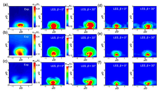 Figure 10 shows the turbulence intensity for each component obtained by the LES, in comparison with the experiment of Burd et al. [34]. As the RANS severely underpredicted the turbulence intensity, the maximum values of all the components for the three models did not exceed 10% and thus did not appear within the contour range in Figure 10. In the simple injection angle (β = 0°) case, at M = 1.0, the LES-obtained distribution was similar to that in the experiment under the same geometry and blowing ratio. Compared with that in Figure 3, the turbulence intensity of all the components was high in the part in which upward flow occurred in the CRVP.