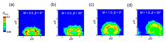 Temperature fluctuations obtained from the LES at x/D = 2.5: (a) M = 0.5, β = 0°; (b) M = 0.5, β = 30°; (c) M = 1.0, β = 0°; and (d) M = 1.0, β = 30°.