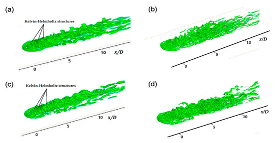 Isosurface of the second invariant of the velocity gradient tensor (Q): (a) M = 0.5, β = 0°; (b) M = 0.5, β = 30°; (c) M = 1.0, β = 0°; and (d) M = 1.0, β = 30°.