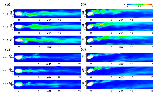In the case of the simple angle (Figure 13a,c), the film cooling appeared around the rim of the hole due to the influence of the horseshoe vortex and hanging vortex. Under a compound angle, the film cooling effectiveness was reduced around the leeward side of the rim (Figure 13b) or eliminated (Figure 13d). This phenomenon was attributed to the main flow being entrained in the shear layer sweeps while the CRVP changed to a single vortex. In the case of the simple angle injection at the blowing ratio of 1.0, most of the insulating film was eliminated after x/D = 10 (Figure 13c) however, in the case of the compound injection angle, the injectant flowed along the wall and maintained the insulating film (Figure 13d).