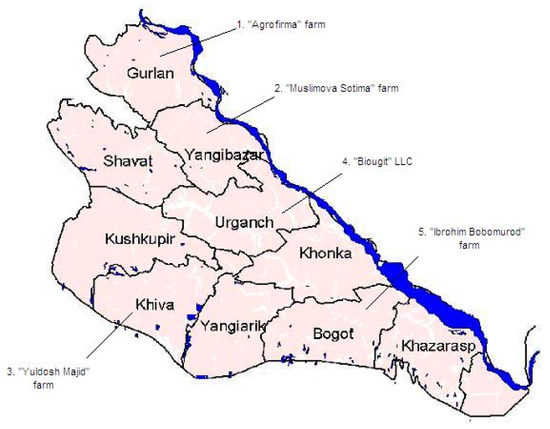 Map of Khorezm region and location of the five farms with high interest in biogas production.