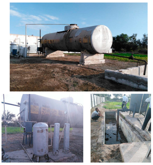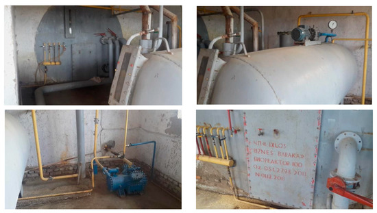 The farm has 200 cattle, and a biogas plant (Figure 4)—owned and operated by an external person—had been built. The biogas plant has a capacity of 60 m3, what is too low for 200 animals; the retention time was significantly less than 10 days. For this reason, the plant had to be regularly re-inoculated with material from a sewage treatment plant.