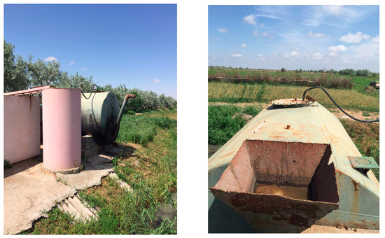 The farm “Yuldosh Majid” with 140 cattle is located next to the border to Turkmenistan and to the desert. There is a biogas plant digesting a part of the manure (Figure 3). The plant consists of a 10 m3 digester (horizontal steel cylinder mounted on two supports) with a device for mixing the content of the digester manually (horizontal axis in the center). The gas is stored under pressure in a vertical cylinder. The liquid manure passes through a funnel to the inlet side and extracts the overflow to the opposite side, filling the small lagoon. There, the liquid—containing dissolved inorganic nutrients—seeps into the ground and into the groundwater, respectively. Remaining solids are collected and brought out to the field.