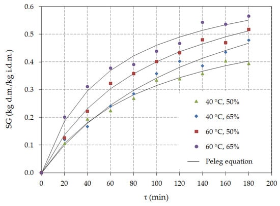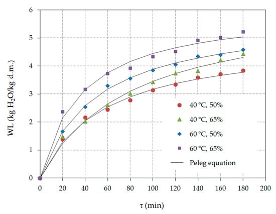 The Peleg model was chosen to predict osmotic dehydration. High coefficients of determination (R2) were obtained for both WL and SG, but the values were higher for WL due to the greater variability of experimental data in SG (Table 3). This was also reflected in higher values of the prediction error indicator (χ2) of RMSE and CRV. Good matching of the data obtained with the Peleg model for the prediction of osmotic drying was also reported by other authors, for apricot slices [], apple cubes [], and melon cubes [].