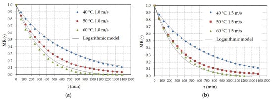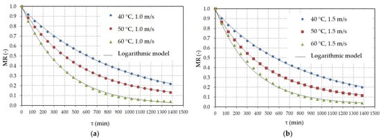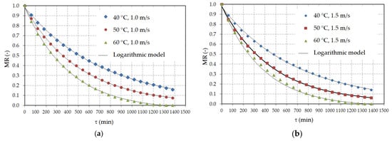 where X0 is the initial water content in the course of drying (kg H2O/kg d.m.), Xτ is water content (kg H2O/kg d.m.) at time τ of the process, Xeq—equilibrium water content (kg H2O/kg d.m.), τ—drying time (min). The equilibrium water content for all experimental units was 0.1 kg H2O/kg d.m. (≈10% wet base).