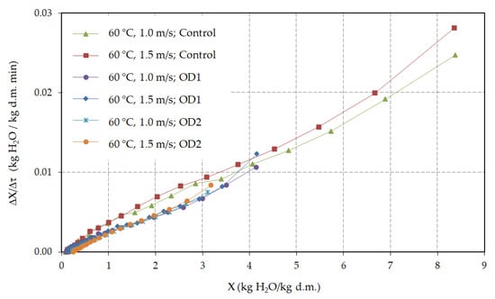 The drying rate was the highest for the control sample due to the difference in initial moisture content and the presence of osmotic agent in the treated samples (Figure 6 and Figures S3 and S4, Supplementary File). The figure (Figure 6) shows that the drying rate was not constant, and the speed was decreasing throughout the process. This indicates a dominant physical-mechanical diffusion of water in the fruit []. After OD1 lasting for 180 min, the moisture content in samples was 4.108 kg H2O/kg d.m., while the control sample developed this moisture content in 220 min at 60 °C and air velocity of 1.0 m/s. After OD2, the samples had a moisture content of 3.148 kg H2O/kg d.m., and the control sample achieved this moisture content in 315 min at 60 °C and air velocity of 1.0 m/s. This means that osmotic dehydration had higher drying rate in the first 180 min of the process compared to HAD. The duration of the HAD process was affected more by higher temperature than air velocity. The results of other authors confirm this conclusion [,].