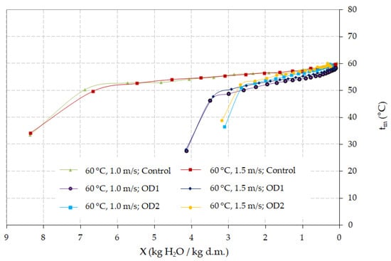 Figure 7 shows the temperatures of apricot halves (tm) measured at a depth of ≈5 mm from the upper surface and for the selected HAD process parameters. There was a difference between temperature of the control and both OD1 and OD2 treated samples, even with the same material moisture content of the samples. Higher inner temperatures were achieved with the control sample. Temperature differences decreased as the moisture content reached equilibrium. Increased air velocity caused faster heating of the apricot halves.