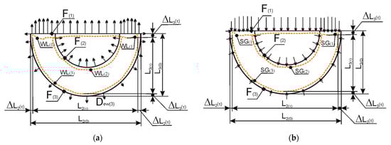 Cross-section of the apricot halves with shrinkage and mass transfer during osmotic dehydration: (a) Water loss (WL); (b) Solid gain (SG). F(1)—Surface after cutting; F(2)—Surface after the stone was removed; F(3)—Surface; L2(0), L2(τ)—Width of apricot half at the beginning of process and at time τ; L3(0), L3(τ)—Thickness of apricot half at the beginning of process and at time τ; WL(1), WL(2), WL(3)—Water loss through surfaces F(1), F(2), F(3); SG(1), SG(2), SG(3)—solid gain through surfaces F(1), F(2), F(3); Δ—difference; → direction of water and solute diffusion, ▪▪▪▪—dash line dimensions after OD.