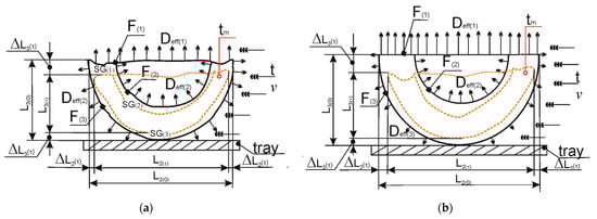 Cross-section of the apricot halves with shrinkage and mass transfer during HAD: (a) with OD pretreatment, (b) Control group. F(1)—Surface after cutting; F(2)—surface after the stone was removed; F(3)—Surface; L2(o), L2(τ)—Width of apricot half at the beginning of the process and at time τ; L3(o), L3(τ)—Thickness of apricot half at the beginning of the process and at time τ; Deff(1), Deff(2), Deff(3)—diffusion of water through surfaces F(1), F(2), F(3); Δ—difference; ▪▪▪▪—dash line, dimensions after HAD; tm—the temperature of apricot halves at a depth of 5 mm; t—hot air, v—air velocity; «—airflow flow direction; → direction of water diffusion on surfaces F(1), F(2), F(3).