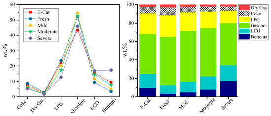 Besides the temperature, the hydrothermal aging time also influenced the deactivation process [25], which presents the daily replacement rate of catalyst (DRRC). So, after repeated exploration of hydrothermal aging temperature and time, the moderate deactivation conditions were tested, and conversion performance was close to the value of 75.01% for E-Cat. Then, the new serial hydrothermal conditions were adjusted with the temperature difference on the basis of the recommended value with the new hydrothermal aging time. The product distributions of E-Cat and Cat.2 are compared in Figure 1, and the ACE run report is listed in Table 5.