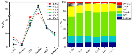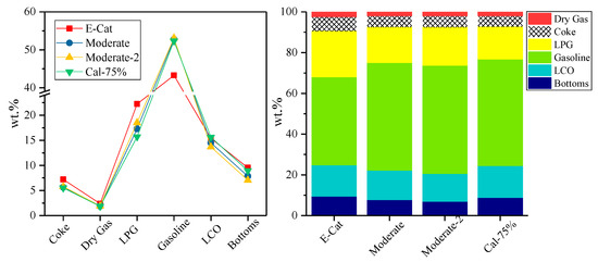 Accordingly, the predicted product distribution at equilibrium conversion for these four compounded catalysts are shown in Figure 4. All compounded catalysts exhibited similar product distributions to that of Cat.2, which is lower yield of LPG and dry gas but higher yield of gasoline than that of E-Cat. LDO-70 was tested as one of the catalysts for heavy oil conversion that can increase propylene yield and the octane number of gasoline [22]; LB-5 showed good resistance for abrasion and heavy metal [23]. By contrast with LDO-70, LPC-70 could improve the accessibility of heavy oil macromolecules to active centers, and then enhance the conversion of heavy oil and the selectivity of gasoline [24]. Therefore, when compared with Cat.2 as a base catalyst, Cat.3 had the highest yield of gasoline, but the lowest yield of dry gas, Cat.4 had the highest yield of LPG. Moreover, Cat.4 had a predicted conversion, about 77%, which deviates from linearity of 75%. This result indicates the Cat.4 has better hydrothermal stability and reactivity.