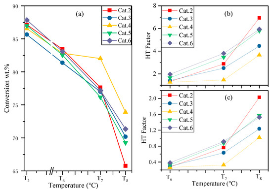 These data prove that the established series of hydrothermal treatments can include and reflect the cycle deactivation process of an industrial unit. Moreover, the HT factors based on the recommended base catalyst in Figure 3b had a larger range, although keeping linear characteristics, while the HT factors based on Cat.2 in Figure 3c showed similar trends to that of the recommended characteristics. This benchmarking treatment promoted us to compare the fresh catalyst with the base one, which would be further applied as an industrial evaluation of hydrothermal deactivation once the base one itself was a working industrial FCC catalyst. Thus, one can see that, compared with Cat.2, Cat.3, and Cat.4, had higher hydrothermal stability, but slightly lower activity, while Cat.5 and Cat.6 would have longer regeneration cycles or lower DRRC if maintaining the same conversion.