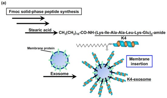 The D-form of the octaarginine peptide (R8) is arginine-rich and can induce efficient macropinocytosis [31,32,33,34,35]. To modify the R8 peptides on exosomal membranes, we stearylated the N-terminus of the peptides and thereby inserted the hydrophobic moiety into the exosomal membrane (Figure 2a) [30]. The functionality of exosomal membrane proteins might be conserved even after anchoring the stearyl peptides on the membranes. In that study, exosomes expressing the tetraspanin CD63-green fluorescent protein (GFP) fusion (CD63-GFP) marker were used to assess cellular uptake. Modifying the membrane surface of exosomes with stearyl-R8 peptides significantly enhanced their uptake via macropinocytosis, with syndecan-4 clustering on the recipient cell membranes [30]. The dependency of cellular uptake efficacy on the peptide concentration on exosomal membranes was also shown (e.g., treatment of 16 μM stearyl-R8 peptides increased 33-fold compared to the cellular uptake of the unmodified exosomes) [30]. Treatment with the macropinocytosis inhibitor, 5-(N-ethyl-N-isopropyl)amirolide (EIPA), significantly reduced the cellular uptake of stearyl-R8-modified CD63-GFP exosomes. On the other hand, the inhibitor did not affect the cellular uptake of exosomes without peptide modifications [30]. The use of the stearyl moiety for anchoring functional peptides on exosomal membranes is promising, and this methodology could foster the development of exosome-based intracellular delivery systems with advanced exosomal functionality.