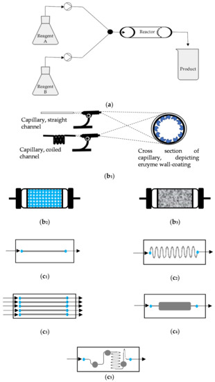 Different types of reactors that are used for biocatalytic reactions carried out under continuous operation in flow chemistry with immobilized biocatalysts. (a) Basic configuration, where reagents are continuously pumped into a reactor containing the immobilized biocatalyst. The reactor can be a tubular type of reactor, such as (b1) open tubular, capillary wall-coated vessel, either as straight channel or coiled; (b2) packed-bed reactor; (b3) monolith reactor; or chip-type reactor with (c1) straight channel; (c2) serpentine channel; (c3) multiple channels; (c4) inclusion of single chambers; (c5) inclusion of multiple chambers. In c1–c5, gray areas correspond to reaction zones where biocatalysts are immobilized.
