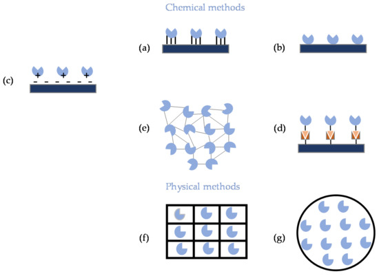 Different immobilization techniques involving chemical methods (a–e) and physical methods (f,g): (a) covalent binding, (b) adsorption, (c) ionic binding, (d) affinity binding, (e) CLEAs, (f) entrapment and (g) encapsulation [14,30].