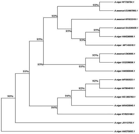 Figure 1 shows the phylogenetic relationship of the 16S ribosomal RNA gene, partial sequence (1693 bp) of the isolated strain, and other strains related to A. niger_MT804610.1 in the GenBank database. The tree results showed that newly isolated species formed a sub-cluster with A. niger_MF093522.1 with 92% bootstrap support. The same observation was made in the neighbor-joining tree method as well (data not shown).