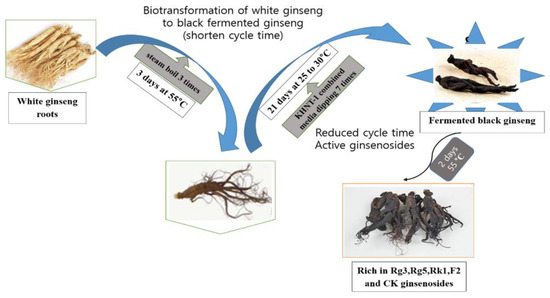 Ginseng is an ancient herb widely consumed due to its healing property of active ginsenosides. Recent researchers were explored to increase its absorption and bioavailability of ginsenosides at the metabolic sites, due to its pharmacological activity. The purpose of this study was to investigate the isolation and characteristics of components obtained by a shorter steaming cycle (seven cycles) of white ginseng to fermented black ginseng, using a novel strain of Aspergillus niger KHNT-1 isolated from fermented soybean. The degree of bioactive of Rg3 increased effectively during the steaming process, and biotransformation converted the color towards black along active ginsenosides. Glycol moiety associated with C-3, C-6, or C-20 underwent rapid biotransformation and hydrolysis, such as Rb1, Rb2, Rc, Rd → Rg3, F2, and was converted to CK. Dehydration produces Rg3 → Rk1, Rg5. Rh2 → Rk2; thus, converted fermented black ginseng was solvent-extracted, and the isolated components were identified by TLC, HPLC, and quantification by LCMS. The unique composition obtained during this process with Rk1, Rg3, Rg5, and CK is nontoxic to HaCaT cell line up to 200 ug/mL for 24 h and was found to be effective in B16BL6 cell lines, in a dose- and time-dependent manner. Thus, it is a suitable candidate for nutraceuticals and cosmeceuticals.