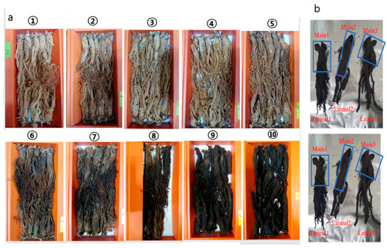 The process of converting the white ginseng to black ginseng requires a steam process, followed by a fermentation process, to convert to fermented black ginseng [15,16]. We performed steaming about three times, for 1 h, and the drying process was carried out before performing the fermentation process seven times, with 1 min dipping in the culture media and drying. During the fermentation, the steam-dried ginseng was dipped into the A. niger containing PDB media at equal intervals over, 25 days, at 25 to 30 deg. During dipping, the dried white ginseng slowly turned black over a period. The visual transformation is represented below (Figure 4a (1–10)). This process confirms the conversion of white ginseng to black-colored ginseng with a normal treatment process without any harsh conditions. To understand the efficacy of the black-colored fermented ginseng, we further checked the conversion at the lateral part and main part of each ginseng, and, interestingly, the conversion was uniformed throughout the sample (Figure 4b).
