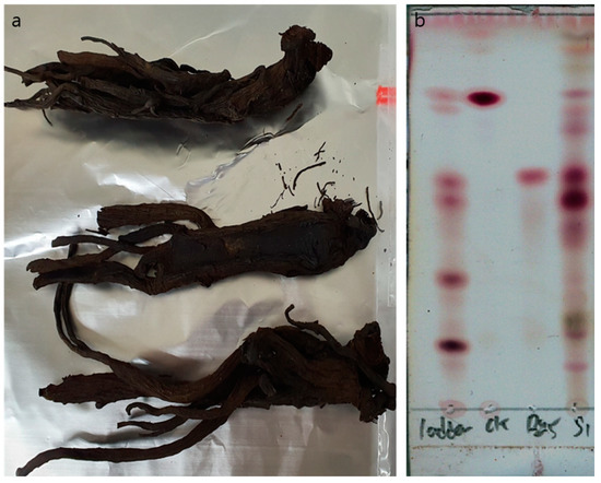 (a) Dried fermented black ginseng. (b) Ginsenosides confirmation by TLC.
