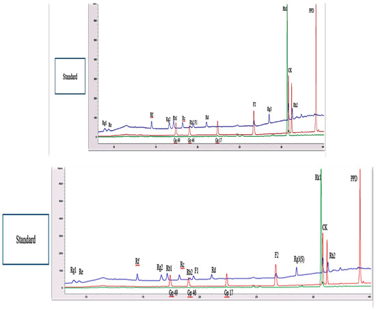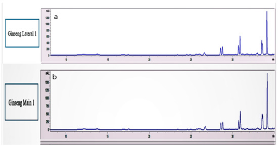 To further quantify and confirm the components, HPLC was performed with standards. HPLC represents clear evidence for the different components. The extracted butanol residue was further characterized by using HPLC with a standard condition and methods. The eluted samples were compared with the standard ginsenosides (Figure 6). Each sample was dissolved in HPLC-grade methanol (1 g/5 mL), filtered using a 0.45 µm filter, and then used for high-performance liquid chromatography (HPLC) analysis. Based on the HPLC chromatograms the fractions from both the lateral (Figure 7a) and the main part (Figure 7b), they are very similar, and it suggests the uniformity of the biotransformation using KHNT-1. For making more quantification purposes, we decided to combine both the extracts and continue for further characterizations and efficacy understanding.