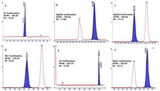 Mass analysis of (a) F2, (b) Rg3, (c) Rg3(S), (d) Rk1, (e) CK1, and (f) Rg5.