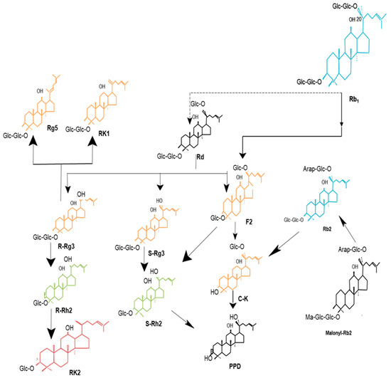 - Liu, C.; Jin, Y.; Yu, H.; Sun, C.; Gao, P.; Xiao, Y.; Zhang, T.; Xu, L.; Im, W.-T.; Jin, F. Biotransformation pathway and kinetics of the hydrolysis of the 3-O- and 20-O-multi-glucosides of PPD-type ginsenosides by ginsenosidase type I. Process. Biochem. 2014, 49, 813–820. [Google Scholar] [CrossRef]
