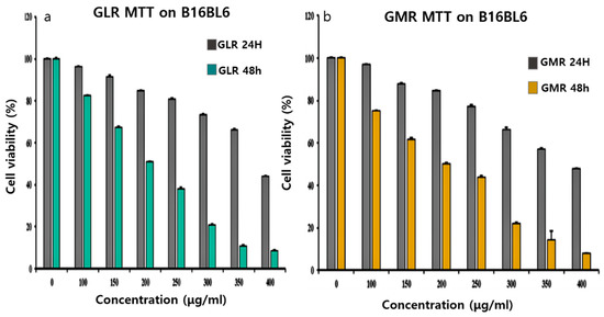 B16BL6 cytotoxicity at 24 and 48 h (a) Ginseng lateral root (GLR) toxicity and (b) Ginseng main root (GMR) toxicity.