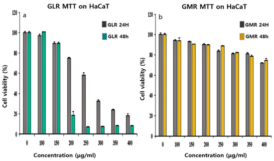 HaCaT cytotoxicity at 24 and 48 h (a) GLR toxicity and (b) GMR toxicity.
