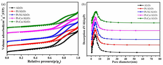 (a) N2 adsorption/desorption isotherms and (b) pore-size distributions for Al2O3, Pt/Al2O3, and Pt-M/Al2O3 samples.