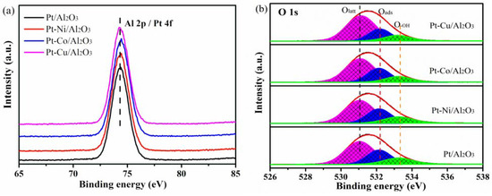 To further investigate the surface composition of these Pt-based catalysts, X-ray photoelectron spectra (XPS) measurement was tested on the four samples. Figure 4 illustrates Al 2p/Pt 4f and O1s XPS spectra of all the samples. Since the characteristic peaks of Al 2p and Pt 4f were close and overlapped in the range of 73~75 eV, thus the valency of platinum was not determined from Figure 4a. XPS spectra of O 1s were also further analyzed, and three oxygen chemical states were observed on the surface of Pt-based catalysts, as shown in Figure 4b. Wherein, the main peak with an O 1s spectrum appears in the position of binding energy (BE) of around 531.1 eV, which was related to lattice oxygen species (Olatt) [33,34]. While the peak at 532.2 eV was considered to be surface absorbed oxygen species (Oads), and the weak peak at 533 eV was ascribed to adsorbed hydroxyl and water molecules (O-OH). Besides, the proportion of three oxygen chemical states over these samples was calculated, the results are shown in Table 2. The oxygen vacancy (Oads + O-OH) ratios were Pt/Al2O3 (39.1%), Pt-Ni/Al2O3 (40.3%), Pt-Co/Al2O3 (42.5%), and Pt-Cu/Al2O3 (36.4%), respectively, indicating that Pt-Co/Al2O3 can provide the higher content of surface oxygen species. The existence of oxygen vacancies was of great significance to the chemical properties and catalytic activities of nanomaterials.